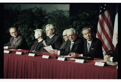 Gathered officials sitting at the signing table at the Dayton Peace Accords, held at Wright-Patterson Air Force Base.