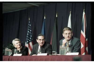 British representative Pauline Neville-Jones, French representative Jacques Blot, and European Union Ambassador Carl Bildt sit at the signing table at the Dayton Peace Accords, held at Wright-Patterson Air Force Base seeming to listen to an unseen speaker.