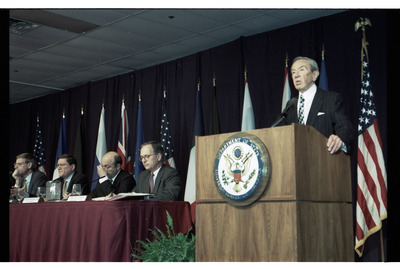 U.S. Secretary of State Warren Christopher speaks behind the podium at the Dayton Peace Accords, held at Wright-Patterson Air Force Base. Seated at the signing table from left to right: European Union Ambassador Carl Bildt, U.S. Assistant Secretary of State Richard Holbrooke, Russian Deputy Foreign Minister Igor Ivanov, and German representative Wolfgang Ischinger.