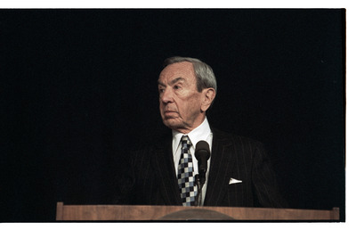 U.S. Secretary of State Warren Christopher speaks behind the podium at the Dayton Peace Accords, held at Wright-Patterson Air Force Base.