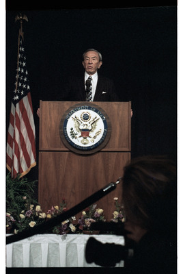U.S. Secretary of State Warren Christopher speaks behind the podium at the Dayton Peace Accords, held at Wright-Patterson Air Force Base.