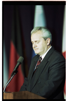Serbian President Slobodan Milošević speaks at the podium during the Dayton Peace Accords signing event, held at Wright-Patterson Air Force Base.