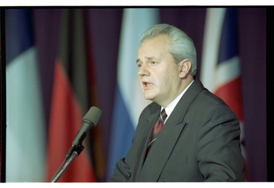 Serbian President Slobodan Milošević speaks at the podium during the Dayton Peace Accords signing event, held at Wright-Patterson Air Force Base.