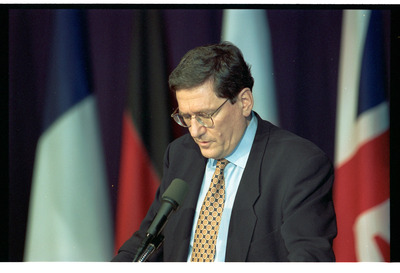 U.S. Assistant Secretary of State Richard Holbrooke speaks behind the podium at the Dayton Peace Accords signing event, held at Wright-Patterson Air Force Base.
