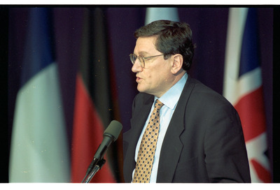 U.S. Assistant Secretary of State Richard Holbrooke speaks behind the podium at the Dayton Peace Accords signing event, held at Wright-Patterson Air Force Base.