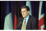 U.S. Assistant Secretary of State Richard Holbrooke speaks behind the podium at the Dayton Peace Accords signing event, held at Wright-Patterson Air Force Base.