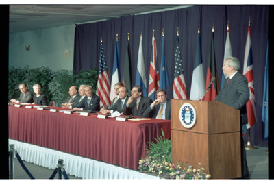 Serbian President Slobodan Milošević speaks behind the podium while other International Officials listen duing the Dayton Peace Accords signing event, held at Wright-Patterson Air Force Base.