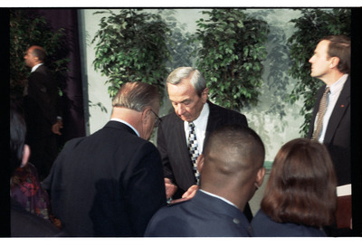 U.S. Secretary of State Warren Christopher speaks with an unidentified man while leaving the Dayton Peace Accords signing event, held at Wright-Patterson Air Force Base.