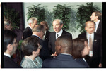 U.S. Secretary of State Warren Christopher speaks with an unidentified man while leaving the Dayton Peace Accords signing event, held at Wright-Patterson Air Force Base.