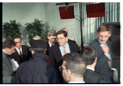 U.S. Assistant Secretary of State Richard Holbrooke turns to speak with an unidentified person while he and European Union Ambassador Carl Bildt leave the Dayton Peace Accords signing event, held at Wright-Patterson Air Force Base.