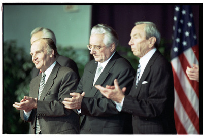 Serbian President Slobodan Milošević, Bosnian President Alija Izetbegović, Croatian President Franjo Tuđman, and U.S. Secretary of State Warren Christopher applaud during the Dayton Peace Accords signing event, held at Wright-Patterson Air Force Base.