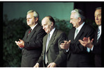 Serbian President Slobodan Milošević, Bosnian President Alija Izetbegović, Croatian President Franjo Tuđman, and U.S. Secretary of State Warren Christopher applaud during the Dayton Peace Accords signing event, held at Wright-Patterson Air Force Base.