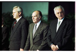 Serbian President Slobodan Milošević, Bosnian President Alija Izetbegović, and Croatian President Franjo Tuđman stand together at the Dayton Peace Accords signing event, held at Wright-Patterson Air Force Base.
