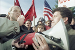 Kosovar Prime Minister Bujar Bukoshi pictured speaking into a megaphone with demonstrators outside Wright-Patterson Air Force Base in Dayton, Ohio. Albanian-Americans protested the exclusion of Kosovo Albanians from negotiations over several days during the Dayton Peace talks.
