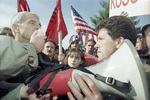 Kosovar Prime Minister Bujar Bukoshi pictured speaking into a megaphone with demonstrators outside Wright-Patterson Air Force Base in Dayton, Ohio. Albanian-Americans protested the exclusion of Kosovo Albanians from negotiations over several days during the Dayton Peace talks.