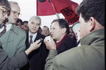 Kosovar Prime Minister Bujar Bukoshi pictured with demonstrators outside Wright-Patterson Air Force Base in Dayton, Ohio. Albanian-Americans protested the exclusion of Kosovo Albanians from negotiations over several days during the Dayton Peace talks.