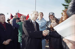 Kosovar Prime Minister Bujar Bukoshi pictured speaking with demonstrators outside Wright-Patterson Air Force Base in Dayton, Ohio. Albanian-Americans protested the exclusion of Kosovo Albanians from negotiations over several days during the Dayton Peace talks.