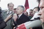 Kosovar Prime Minister Bujar Bukoshi pictured speaking into a megaphone surrounded by demonstrators outside Wright-Patterson Air Force Base in Dayton, Ohio. Albanian-Americans protested the exclusion of Kosovo Albanians from negotiations over several days during the Dayton Peace talks.