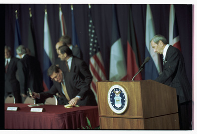 MS-458_NGP_Underwood_05; Bosnian Peace Signing_1995_11_21_007; Dayton Daily News; Dayton Peace Accords (1995); Yugoslav War, 1991-1995--Bosnia and Herzegovina; Yugoslav War, 1991-1995 -- Peace; Christopher, Warren, 1925-2011