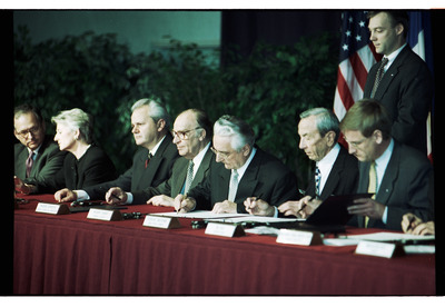 MS-458_NGP_Underwood_05; Bosnian Peace Signing_1995_11_21_016; Dayton Daily News; Dayton Peace Accords (1995); Yugoslav War, 1991-1995--Bosnia and Herzegovina; Yugoslav War, 1991-1995 -- Peace; Ischinger, Wolfgang, 1946-; Neville-Jones, Pauline, 1939-; Milošević, Slobodan, 1941-2006; Izetbegović, Alija, 1925-2003; Tuđman, Franjo; Christopher, Warren, 1925-2011; Bildt, Carl, 1949-