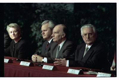 MS-458_NGP_Underwood_05; Bosnian Peace Signing_1995_11_21_022; Dayton Daily News; Dayton Peace Accords (1995); Yugoslav War, 1991-1995--Bosnia and Herzegovina; Yugoslav War, 1991-1995 -- Peace; Neville-Jones, Pauline, 1939-; Milošević, Slobodan, 1941-2006; Izetbegović, Alija, 1925-2003; Tuđman, Franjo