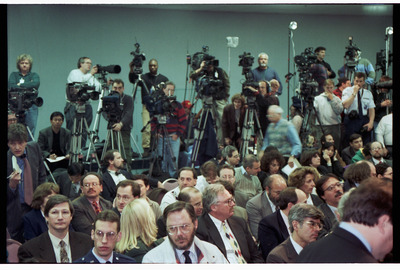 Audience members attending the signing of the Dayton Peace Accords at Wright-Patterson Air Force Base, with members of the media positioned behind them on an elevated platform, operating cameras mounted on tripods.
