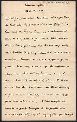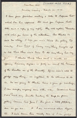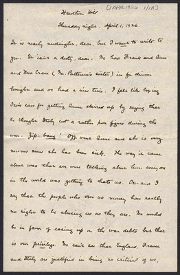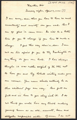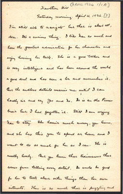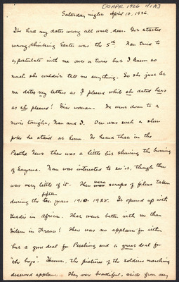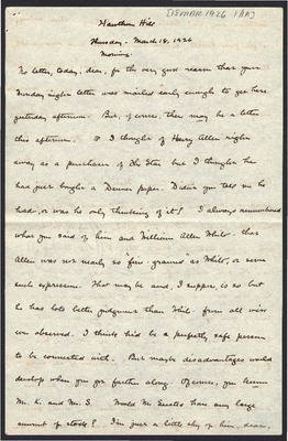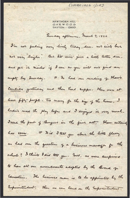 This letter is undated and unattached to any other letter, but is believed to have been written on October 27, 1926. In this letter, Katharine Wright writes to Henry Haskell describing her day to him, commenting about articles she has read, and other aspects of her daily life.