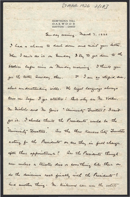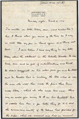 This letter is undated and unattached to any other letter, but is believed to have been written on October 26, 1926. In this letter, Katharine Wright writes to Henry Haskell opening with a declaration against the weather in Dayton. She touches on some legal trouble the Kansas City Star is having, a dinner she and Orville attended in honor of General Gillmore's promotion to head of Wright Field that had too much drinking for her taste, her continued depression in the wake of Orville's rejection of their marriage, and other aspects of her daily life.