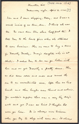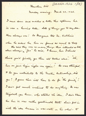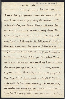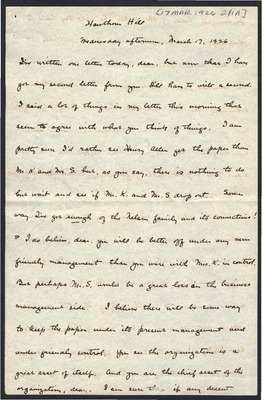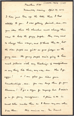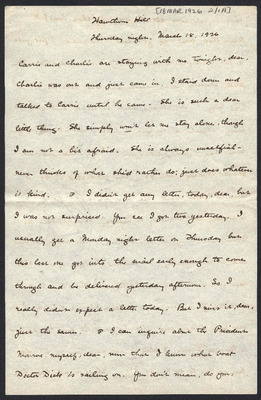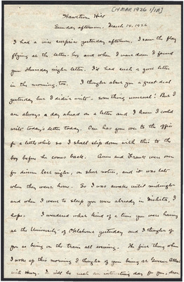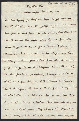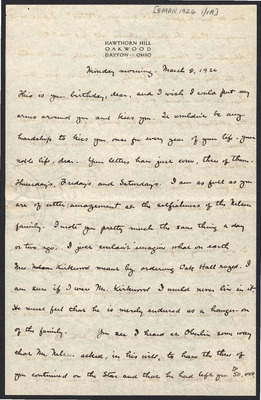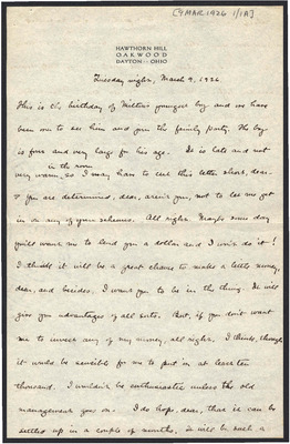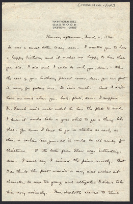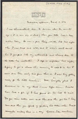 This letter is undated and unattached to any other letter, but is believed to have been written on October 19, 1926. In this letter, Katharine Wright writes to Henry Haskell about her daily life, telling him she will talk to Lorin when Orville leaves the next day, updating Henry about how Lou's visit is going, and assuring him his letter wasn't badly received at all.
