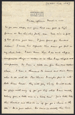 This letter is undated and unattached to any other letter, but is believed to have been written on October 19, 1926. In this letter, Katharine Wright writes to Henry Haskell about her continued distress about Orville's reaction to their relationship, a telephone call from the Lords, her new dress, and some issues with the stock of the Kansas City Star in addition to other aspects of her daily life.