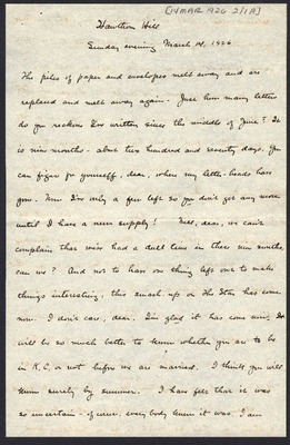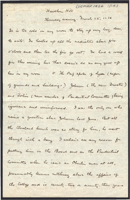 These letters illustrate her life in her later years, allowing us a glimpse of who she was as a private person. She writes of her thoughts on a variety of topics and her daily life. Among other topics and events, we get insight into her life as companion and assistant to her brother Orville, her work on the Oberlin College Board of Trustees, her romantic relationship with Henry, and the many friendships she fostered throughout her life.