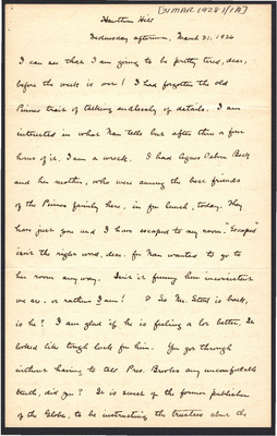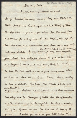 This letter is undated and unattached to any other letter, but is believed to have been written on October 21, 1926. In this letter, Katharine Wright writes to Henry Haskell. She tells him of her friends coming to stay with her and Orville, and laments about how difficult it can be to get a man to stay for more than a day in their day and age. She mentions how hard it is for her to discuss things with Orville now and fears how unhappy the rest of her family will be at her decision.