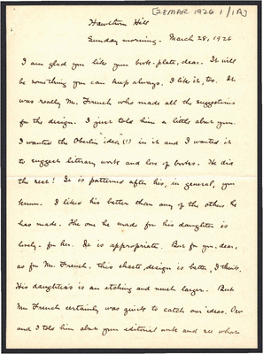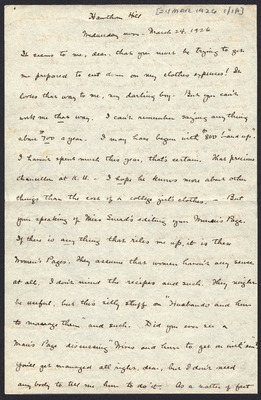 This letter is undated, and unattached to any other letter, but is believed to have been written on October 28, 1926. Katharine Wright writes to Henry Haskell mentioning the drive they are putting in, how some of her friends and family are reacting to her relationship with Henry, and details of setting up their house.