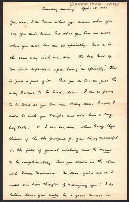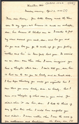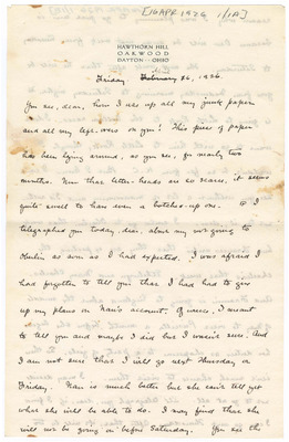 This letter is undated and unattached to any other letter, but is believed to have been written on October 28, 1926. In this letter, Katharine Wright writes to Henry Haskell assuring him that she loves him despite her anxiety surrounding Orville. She describes her Lou's visit and other aspects of her daily life.