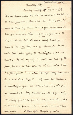 This letter is undated and unattached to any other letter, but is believed to have been written on November 2, 1926. In this letter, Katharine Wright writes to Henry Haskell about her friend, her anxiety about moving to Kansas City, and other aspects of her daily life.