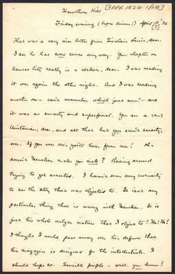 This letter is undated, and unattached to any other letter, but is believed to have been written on October 16, 1926. Katharine Wright writes to Henry Haskell commending him for his speech to the Kansas University students, expresses her displeasure at reading anything but Scripture at funerals, and continues to agonize over her broken relationship with Orville and her indecision whether she should go to Kansas City.