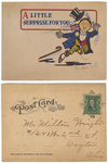 An undated postcard that says "A Little Surprise for You", picturing a man in a top-hat tripping and falling. Sent from Orville Wright to his nephew, Milton Wright.