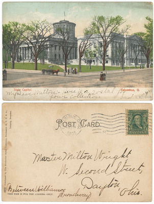 A Columbus, Ohio postcard featuring the State Capitol Building. Sent from Sadie Edna to Milton Wright in 1905.